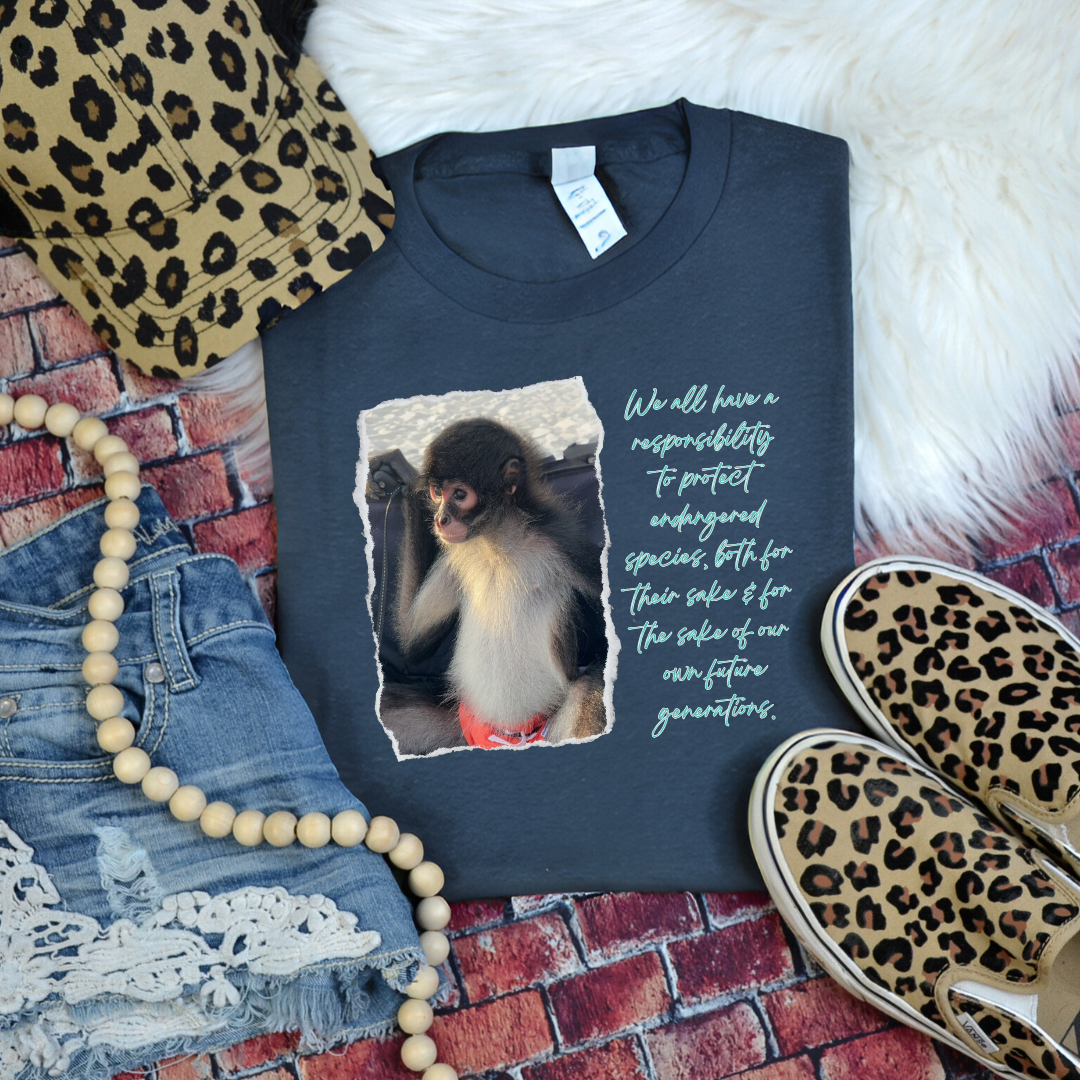 This custom design shirt features an adorable photo of Spider Monkey Abu with a very important endangered species quote. Shirt color is Heather Navy.